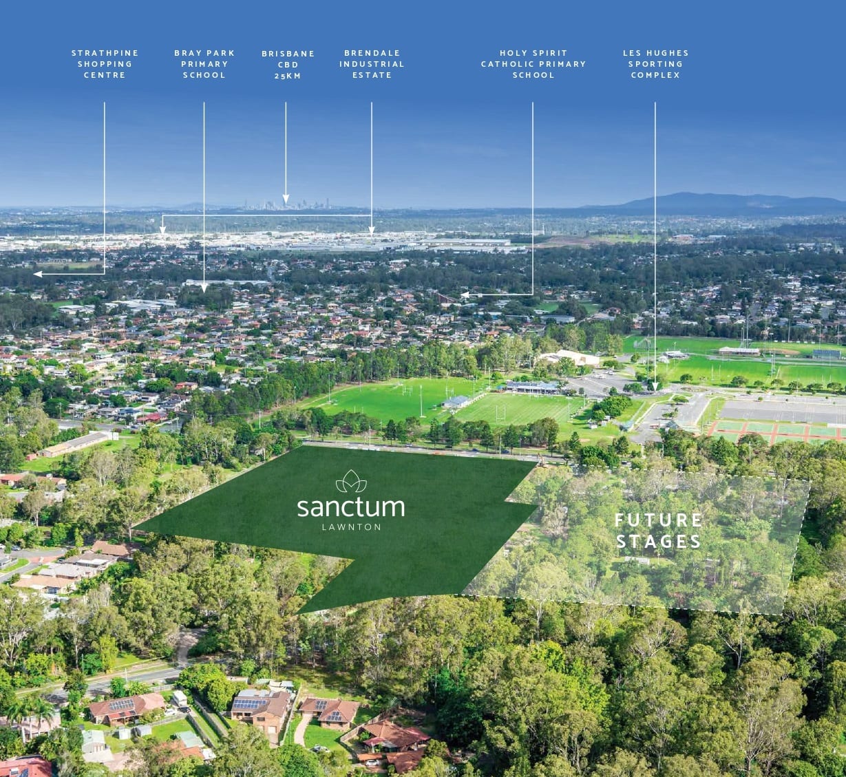 Sanctum is located in the heart of convenience, just a short drive to major shopping centres such as Strathpine and Westfield North Lakes, as well as local convenience centres such as Coles at Kensington Village. The Lawnton area is rich with parks, bushland and sporting centres. The Les Hughes Sporting Complex – the mecca of sports in the Pine Rivers area – is directly opposite Sanctum. Work meets lifestyle with The Brendale Industrial Estate located just 3km from Sanctum. This is one of the largest industrial, logistics and warehousing areas in the greater Brisbane area and a major contributor to employment in the Strathpine, Lawnton and Warner areas.